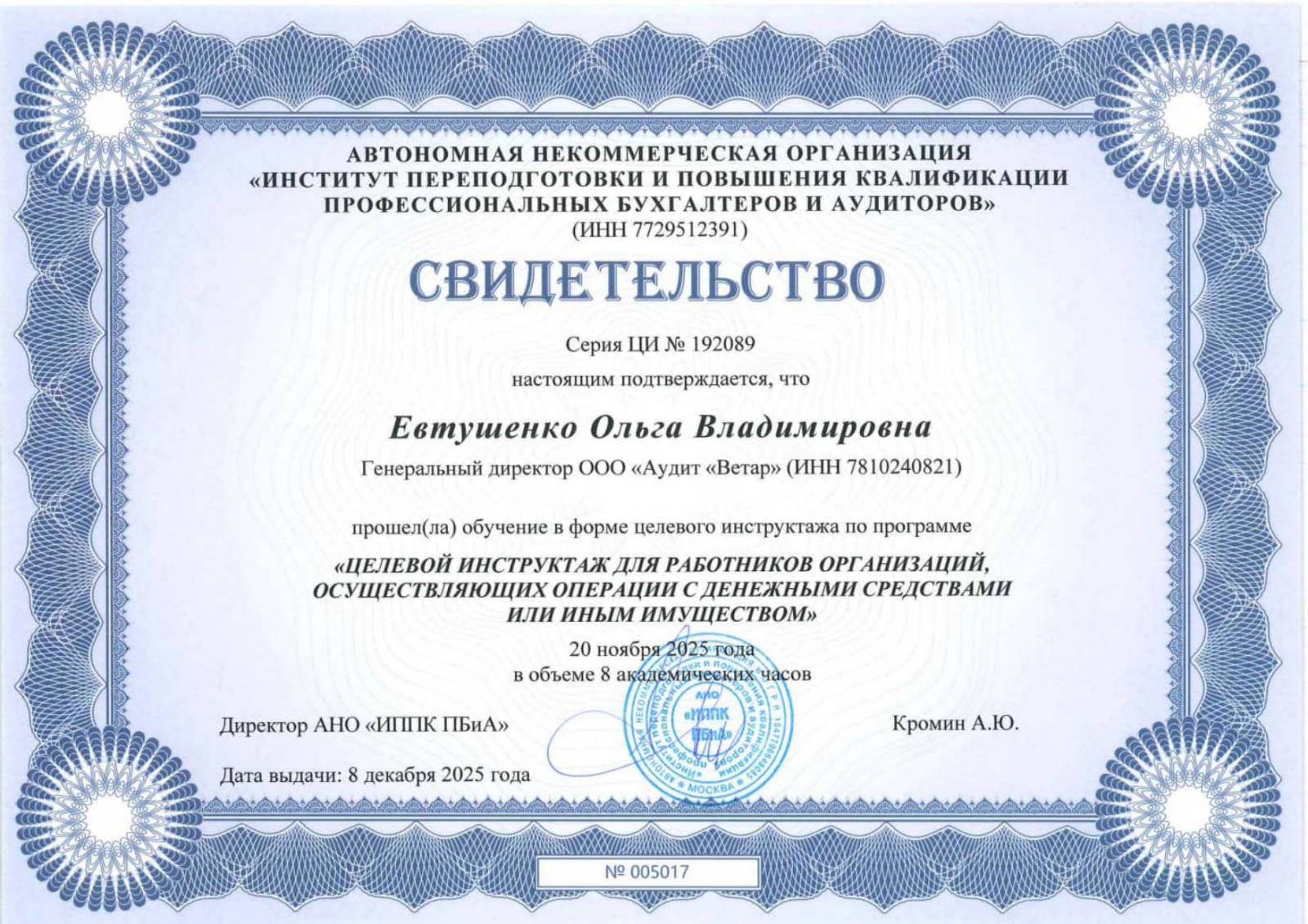 Поздравляем нашего генерального директора Евтушенко Ольгу Владимировну, заместителя генерального директора Романович Елену Сергеевну и ведущего аудитора Пушихину Валентину Альбертовну с успешным прохождением обучения по программе обучения в форме целевого инструктажа работников аудиторских организаций, индивидуальных аудиторов в целях противодействия легализации (отмыванию) доходов, полученных преступным путем, и финансированию терроризма.