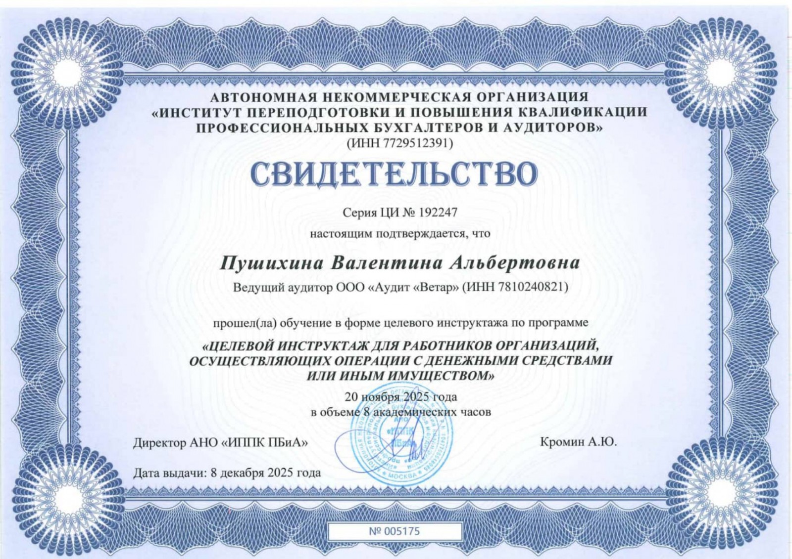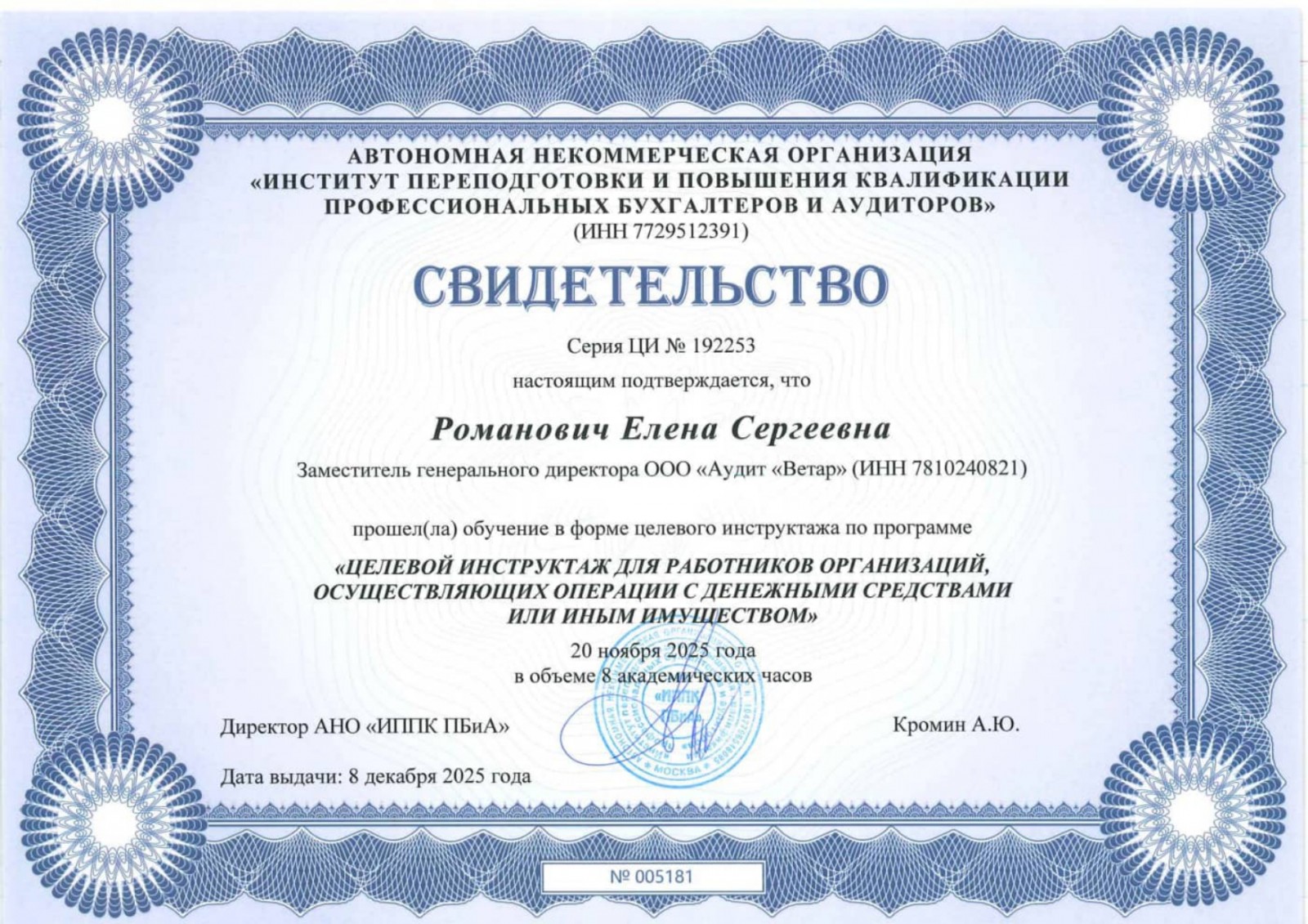 Новости / 15 декабря 2025 г. Поздравляем нашего руководителя и сотрудников с получением сертификатов по «Программе обучения в форме целевого инструктажа работников аудиторских организаций в целях противодействия легализации (отмыванию) доходов, полученных преступным путем, и финансир